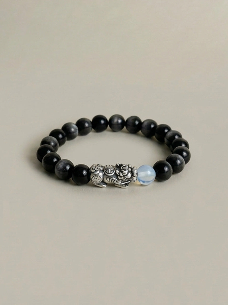 AAA天然黒曜石 貔貅(ヒキュウ)ブレスレット|999純銀・ムーンストーン・風水 招財守護ブレスレット