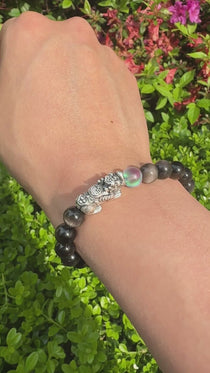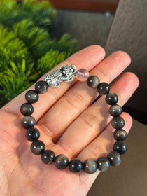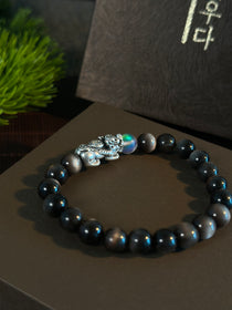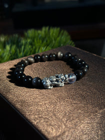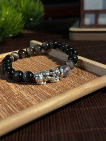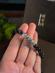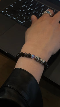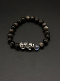 AAA天然黒曜石 貔貅(ヒキュウ)ブレスレット|999純銀・ムーンストーン・風水 招財守護ブレスレット